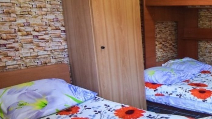 В номере двуспальная и двухъярусная трехспальная кровать.