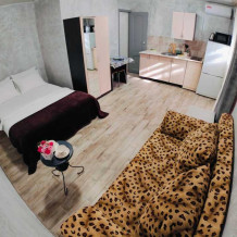 В номере есть все необходимое: кухонная зона, двухспальная кровать 1,4 м и два дивана- кровать 1.4 м, шкаф, прикроватная тумба, стол, tv, холодильник, сплит - система, фен, чайник, микроволновая печь, варочная панель, набор посуды, набор полотенец, совмещённый санузел и косметика для ванны.