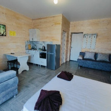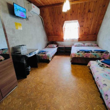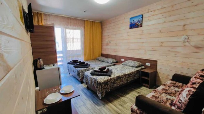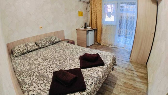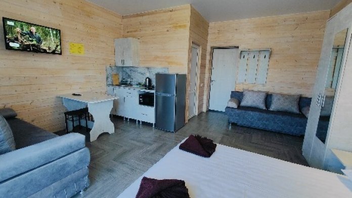 В номере есть все необходимое: двухспальная кровать 1, 4 м и диван-кровать 1. 4 м, шкаф, прикроватная тумба, письменный стол, tv, холодильник, сплит - система, фен, чайник, набор посуды, набор полотенец, совмещённый санузел и косметика для ванны. В стоимость номера включено: бассейн с подогревом 4*8 с детской зоной, шезлонги, зона барбекю и столики, детская площадка, анимация для детей- летом, wi-fi, кухни для самостоятельного приготовления.