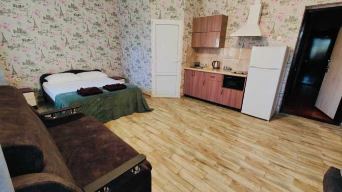 Уютный однокомнатный номер с кухней для 4-6 гостей, площадью 25 м² на 1 этаже, вход по коридору.