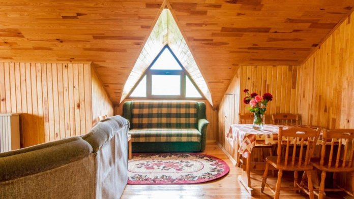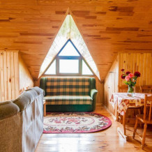 Трехкомнатный семейный номер находится на третьем этаже (мансардный). В номере две спальни с двуспальными кроватями и большой зал. В зале раскладной диван двухместный, мягкий уголок, камин, обеденный стол, небольшой кухонный уголок с раковиной, чайником и микроволновкой. Также в номере есть кондиционер, холодильник, телевизор и электро обогреватели. Перед номером небольшая терраса со столом и стульями.