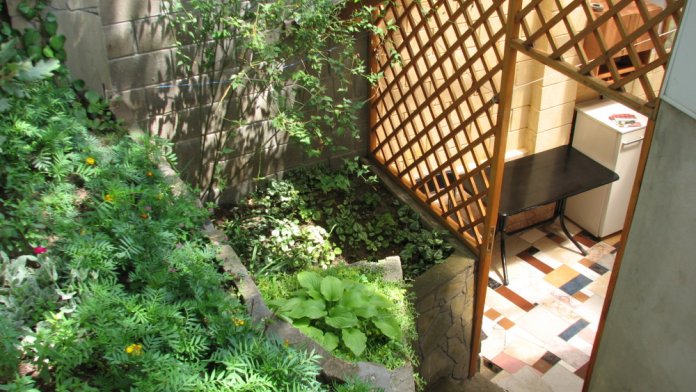 Стандартны большой номер с балконом-верандой и санузлом . Вход сразу воле калитки Гостевого дома минуя подъем. В номере Двуспальная кровать, диванчик , шкаф, комод, телевизор, мини кухня , холодильник.