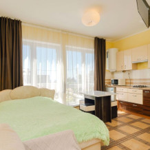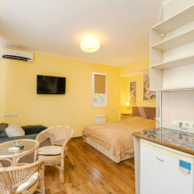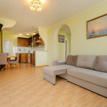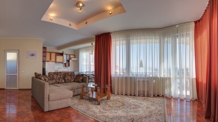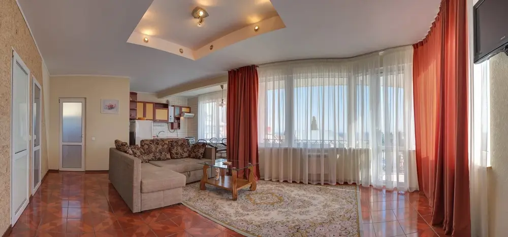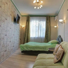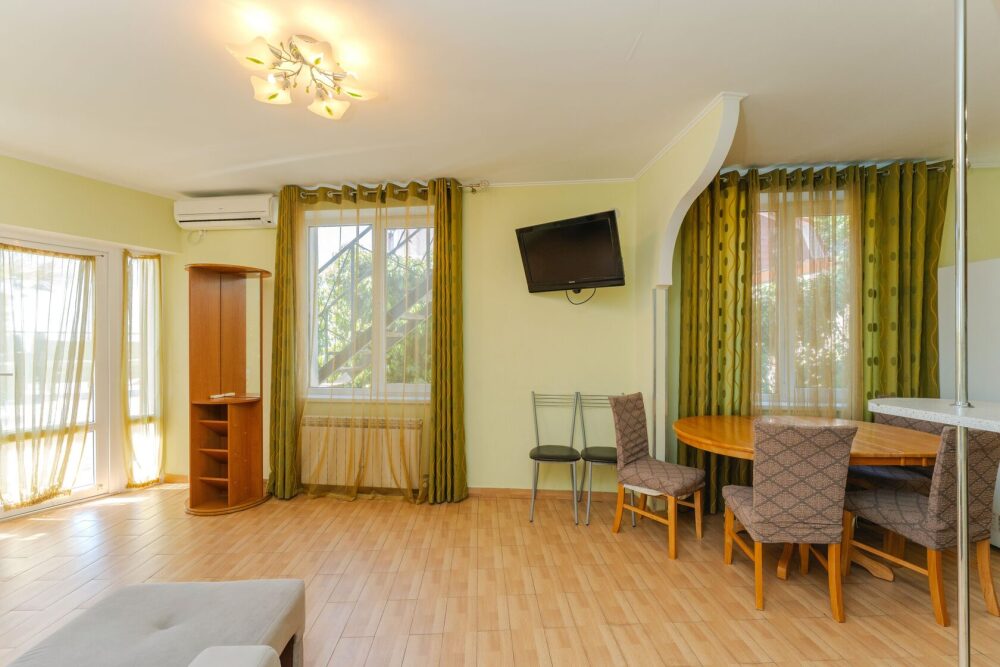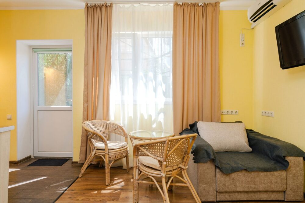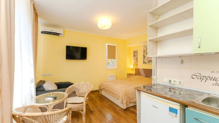На первом этаже обустроено три стандартных номера и общая для них кухня. На втором и третьем этаже находятся два номера повышенной комфортности — апартаменты, полностью приспособленные для домашней жизни. Каждый номер оборудован спальными местами, кондиционером, ЖК-телевизором, индивидуальным санузлом и душем. Помимо комфортного размещения и ежедневной уборки номеров, гостевой дом также предоставляет услугу трансфера из аэропорта Симферополь и обратно.