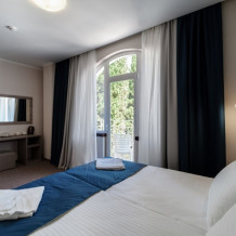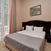 Окна номеров выходят в парк отеля. Наслаждайтесь сочетанием горного и морского воздуха, находясь в самом центре можжевеловой рощи. Номер полностью укомплектован. В номере двуспальная кровать и диван. Ортопедическая кровать, мягкое кресло, плазменный телевизор. Просторный санузел и натуральная косметика. Расположение: Номера данной категории располагаются в исторической вилле 19 века Лимена и в корпусе Шипилова. Кровати: одна большая кровать. Ванная комната: душ.