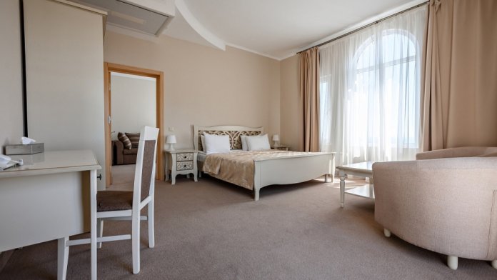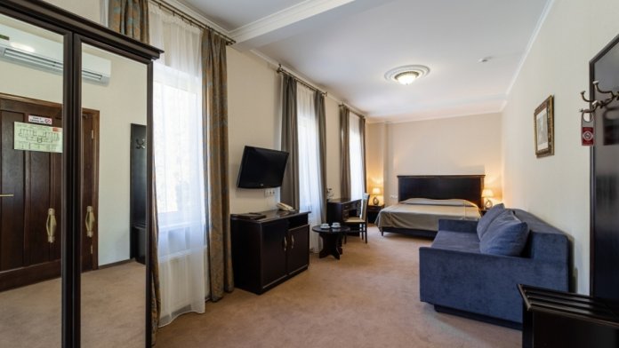 Комплектация: изысканная деревянная мебель, телевизор, кондиционер, двуспальная ортопедическая кровать или две односпальные, рабочая зона, мини холодильник, Wi-Fi, сейф. В туалетной комнате полотенца, фен, натуральная косметика, тапочки.