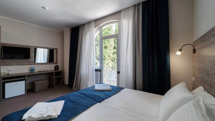 Однокомнатный номер подойдёт для двухместного размещения, а также для семейной пары с ребёнком до 11 лет включительно, который с комфортом разместится на кресле-кровати. Все номера имеют выход на балкон или террасу, которые оснащены мебелью для отдыха.