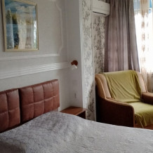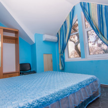 Номер находится на третьем этаже и состоит из двух комнат. Просторная светлая спальня с большим панорамным окном в сторону моря, двуспальная кровать. В гостиной удобный диван на два человека и телевизор (спутниковое ТВ). На просторной террасе находится стол для отдыха. С террасы открывается прекрасный вид на море и на южный берег Крыма до Семеиза, wi-fi.