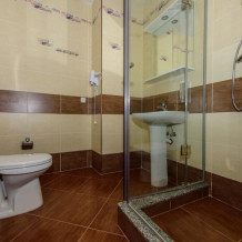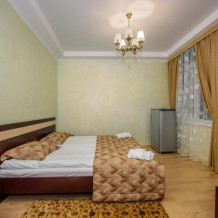Площадь номера: 18 кв.м. В номере: одна двуспальная кровать, кресло - кровать, стол, стулья, прикроватные тумбочки, шкаф-купе, кондиционер, телефон, зеркало, тумбочка, набор полотенец, набор постельного белья, телевизор, холодильник. В ванной: туалет, раковина, душевая кабина, средства личной гигиены, фен, зеркало.