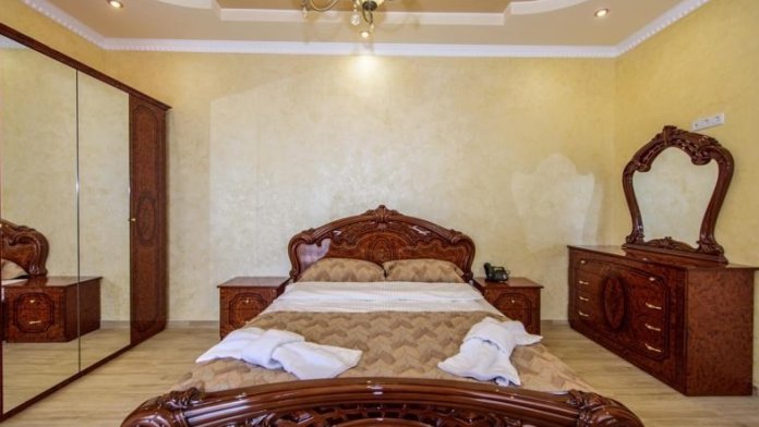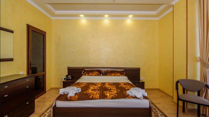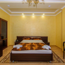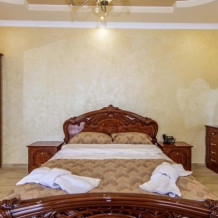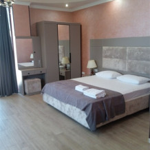 В номере: одна двуспальная кровать, кресло - кровать, стол, стулья, шкаф, прикроватные тумбочки, шкаф-купе, кондиционер, зеркало, тумбочка, набор полотенец, набор постельного белья, телевизор, холодильник.