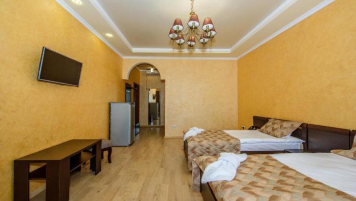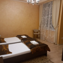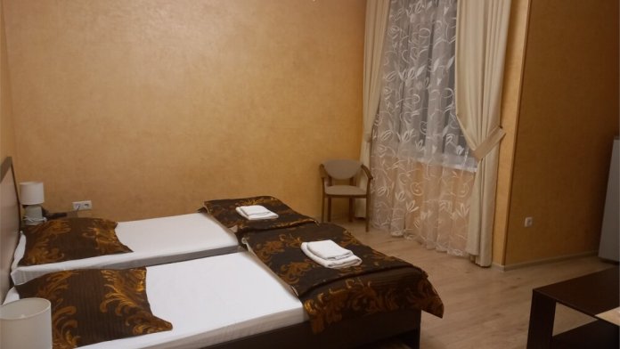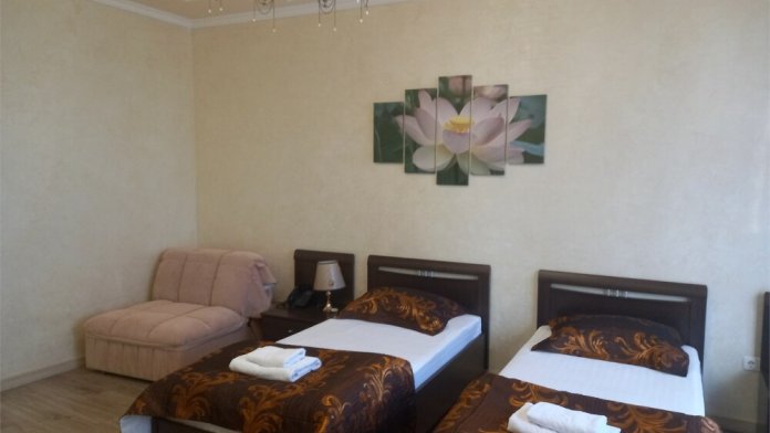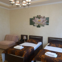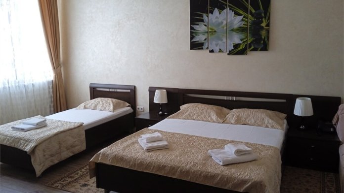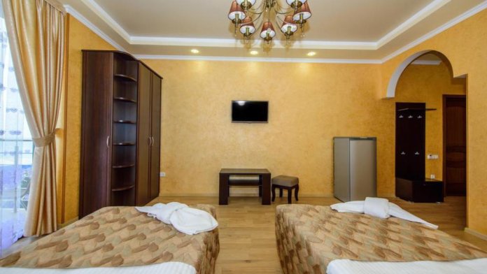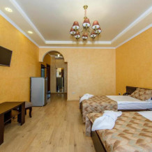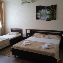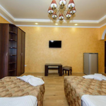 Площадь номера: 22 кв. м. В номере: двуспальная кровать, односпальная кровать, кресло - кровать, стол, стулья, шкаф, две прикроватные тумбочки, кондиционер, телефон, набор полотенец, набор постельного белья, телевизор, холодильник.