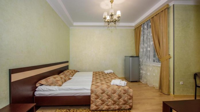 Двухместный номер с одной двуспальной кроватью. В номере есть собственный санузел с душевой кабинкой. Кондиционер, телевизор, вся необходимая мебель. Гостям предоставляются бесплатные туалетно-косметические принадлежности и фен. Окно в номере глухое (дневного света в номер не поступает).