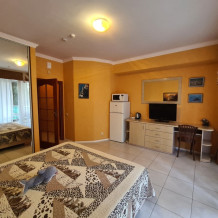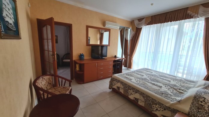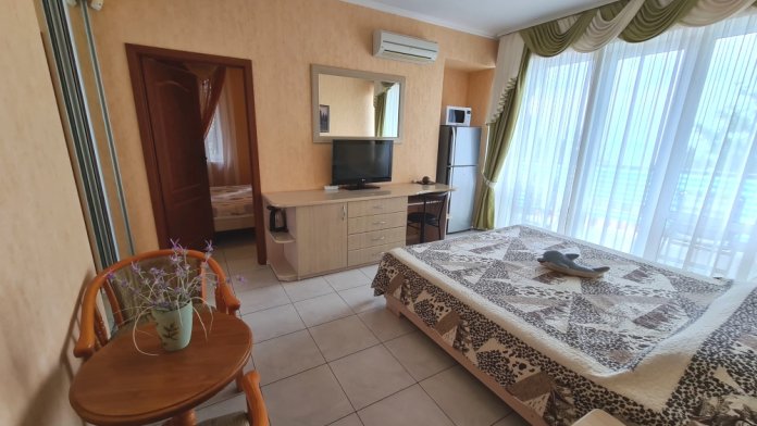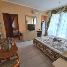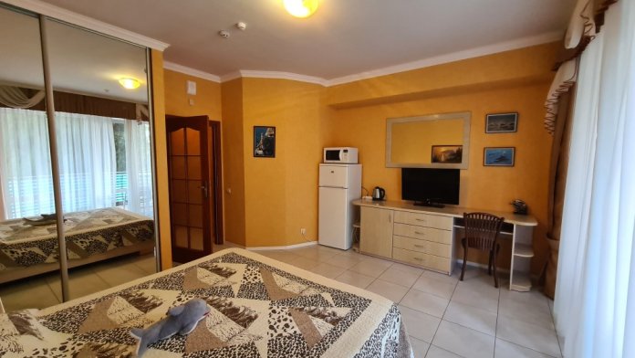 В номере: кондиционер, холодильник, ж/к телевизор, спутниковое тв, бесплатный wi-fi, набор посуды, микроволновая печь, чайник, тостер, фен, гладильные принадлежности, мини-сейф, салфетки, карты игральные, сушилка для одежды. В ванной комнате: полотенца на каждого человека, мыло, шампунь, шапочка для душа, одноразовые тапочки, По требованию предоставляются: дополнительная раскладушка, мангал с принадлежностями, бадминтон и другие полезные мелочи.