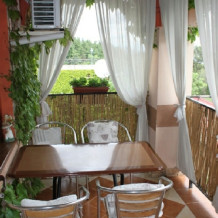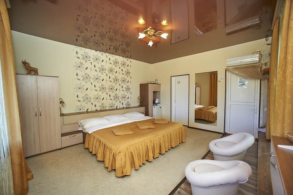 Номер оборудован всем самым необходимым: LCD-телевизор (спутниковое телевидение), кондиционер, холодильник, электрочайник, набор посуды, душ (холодная/горячая вода круглосуточно), туалет, фен, WI-FI интернет, тапочки. На уютном балконе стол со стульями.