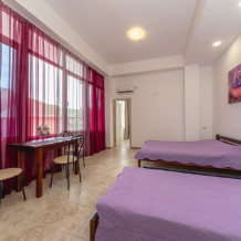 В номере находится мини-кухня, три двуспальных кровати и односпальная кровать из натурального дерева, диван, стол, стулья, кондиционер, телевизор, фен, электрочайник, набор посуды, холодильник, cушилка для белья, постельное белье, полотенца, санузел, душевая, Wi-Fi, балкон.