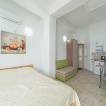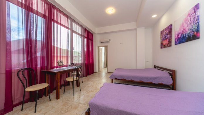 В номере находится мини-кухня, двуспальная и односпальная кровати из натурального дерева, диван, стол, стулья, кондиционер, телевизор, фен, электрочайник, набор посуды, холодильник, cушилка для белья, постельное белье, полотенца, санузел, душевая, Wi-Fi, балкон.