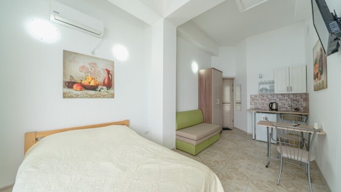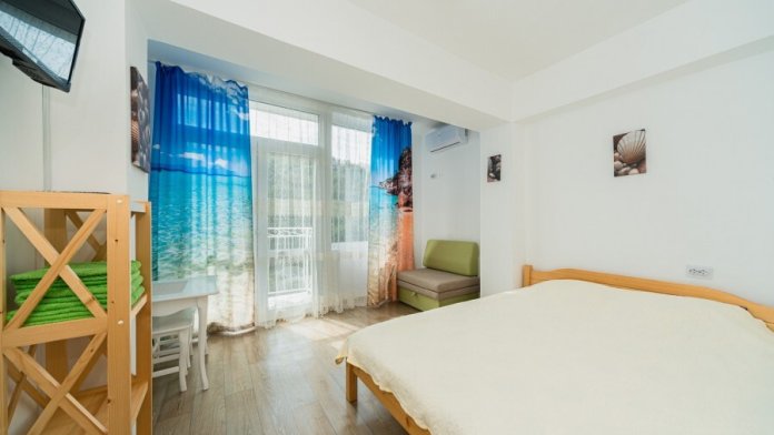 В номере находится мини-кухня, двуспальная кровать из натурального дерева, диван, стол, стулья, кондиционер, телевизор, фен, электрочайник, набор посуды, холодильник, cушилка для белья, постельное белье, полотенца, санузел, душевая, Wi-Fi, балкон.