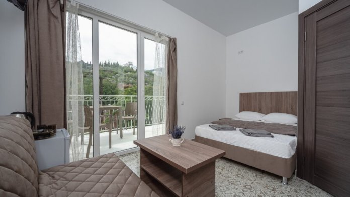 Двухкомнатный семейный номер, вмещающий до 5х гостей. Вид на море и личная терраса на свежем воздухе в окружении зелени.