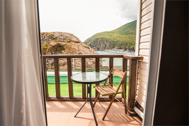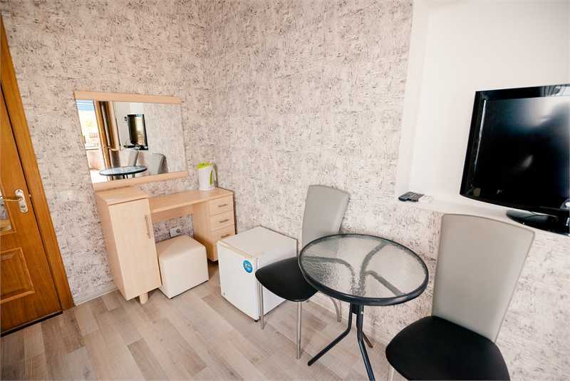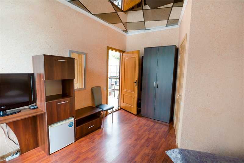 Однокомнатный номер категории стандарт на двоих человек с двухярусной кроватью, с отдельным входом выходящим во внутренний двор отеля. На втором этаже односпальная кровать, где будет удобно расположиться ребёнку, а внизу комфортная двухярусная кровать для родителей. В номере панорамное окно с видом на море.