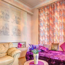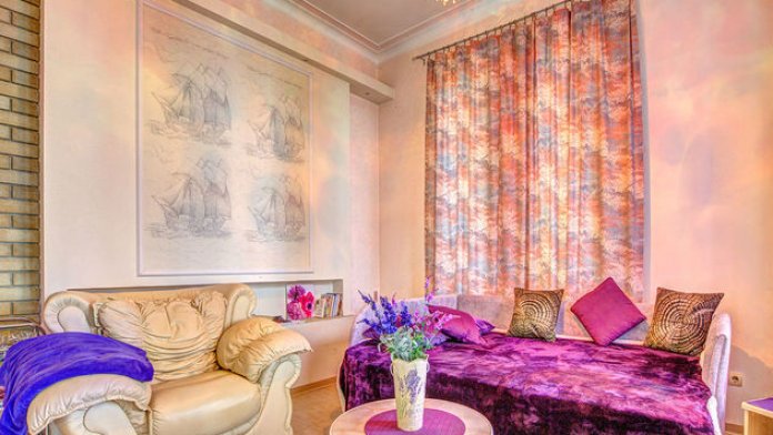 Светлый однокомнатный номер с балконом. Он расположен в 3-комнатном отдельно стоящем коттедже на три номера, у каждого номера отдельный вход, дворик с набором летней мебели, видом на море и сад. Оформление в лавандовых тонах настроит на расслабленный комфортный отдых у моря.