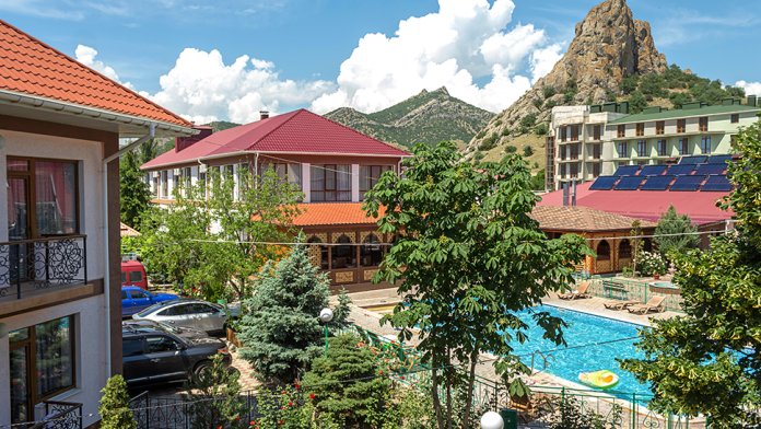 База отдыха находится в замечательном тихом и уютном поселке Курортное у самого подножья вулканического массива Кара-Даг на берегу Черного моря в устье реки Огузка. Это место, благодаря уникальным климатическим условиям, красоте ландшафта, богатству и разнообразию растительности, является идеальным местом для тех, кто предпочитает тишину и уединение, а также для отдыха с детьми.