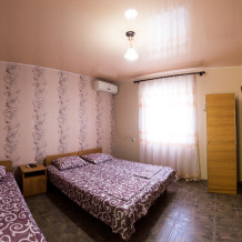 Двухкомнатный номер в здании на 6 номеров, на первом этаже. В номер ведёт отдельный, изолированный вход. Номер рассчитан на 6 человек. В комнатах кондиционер. Совмещённый санузел на две комнаты. На крытой веранде индивидуальная кухня с беседкой и большим топчаном. Телевизор на веранде. После жаркого летнего дня, так приятно отдохнуть выпить бокал вина, пожарить шашлык. Для вечерних посиделок у нас мангальная зона, беседки. Возможна организация питания под заказ.