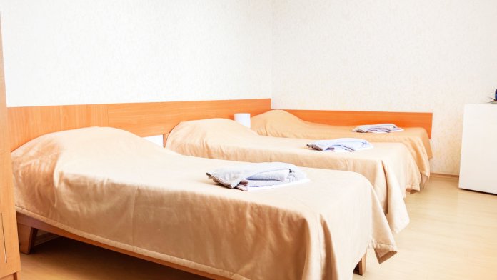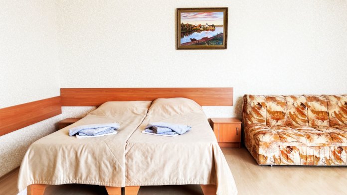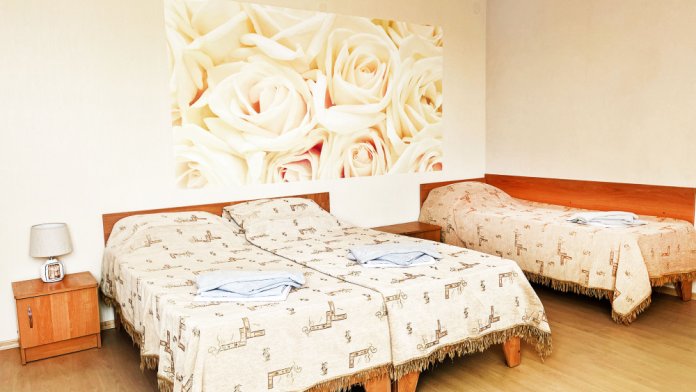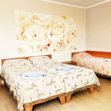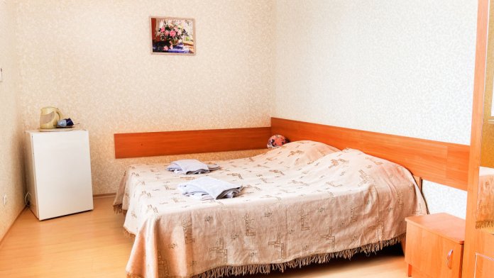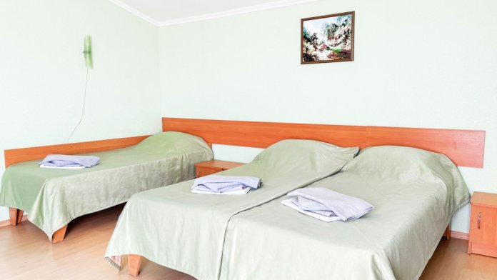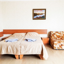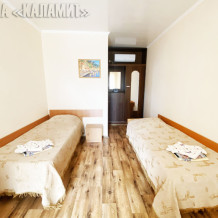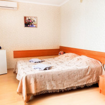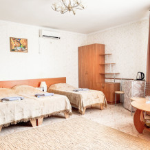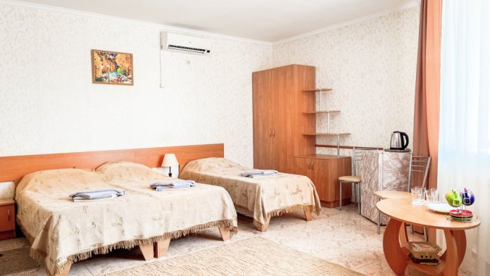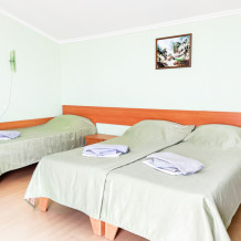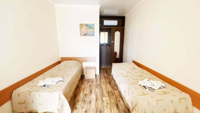 Номер однокомнатный, расположен на первом этаже основного здания. В номере имеется всё, что необходимо для комфортного отдыха: душ, туалет, ТВ, холодильник, кондиционер, фен, сейф, электрический чайник, набор полотенец на каждого отдыхающего (банное, пляжное, лицевое, ножное), набор посуды (сервиз, тарелки, стаканы, ложки, разделочная доска, штопор), приветственный набор гигиенических средств (кусковое и жидкое мыло, шампунь), туалетные принадлежности, сушилка для белья. В номере 3 односпальные кровати.