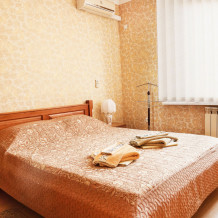 Двухкомнатный номер с собственной террасой подойдет для большой семьи. В номере есть все для комфортного отдыха. 4 удобных спальных места. Возможно установить допместа. Кондиционер и ТВ в каждой комнате, холодильник, электрический чайник, сейф, полотенца, туалетно-гигиенические принадлежности, фен, сушилка для белья. Номер расположен в одноэтажном здании. Окна выходят на террасу. На террасе легкая пластиковая мебель. В жаркий день здесь всегда прохладно. Свой санузел с душем. Горячая и холодная вода подаются круглосуточно. Ежедневная влажная уборка. Смена белья - 1 раз в пять дней.