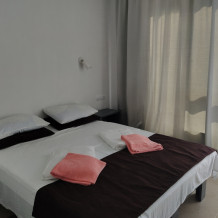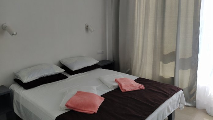 В номере односпальные (двуспальные) кровати, шкаф, тумбочки, стол, стулья. Кондиционер в одной комнате.
