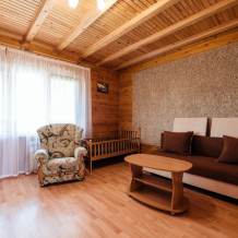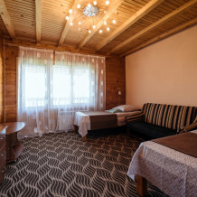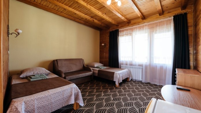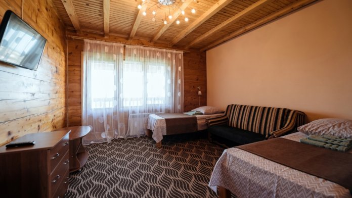 Здание гостиницы совсем новое, построено в 2014 году. При возведение стен использовался экологически чистый материал - цельный, химически не обработанный брус карпатской ели. Поэтому, все номера в гостинице сохраняют комфортную температуру и естественную влажность, а смолянистые вещества ели, которые наполняют воздух в комнатах благоприятно влияют на здоровье.