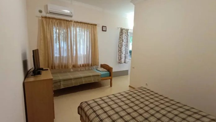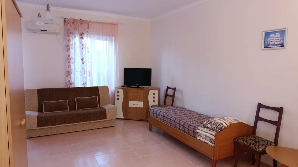 В номере: двуспальная и односпальная кровати, двуспальный диван, холодильник, кондиционер, телевизор, столик, посуда. Удобства в номере с душем и индивидуальным бойлером.