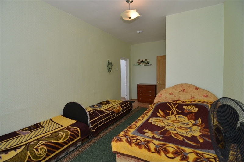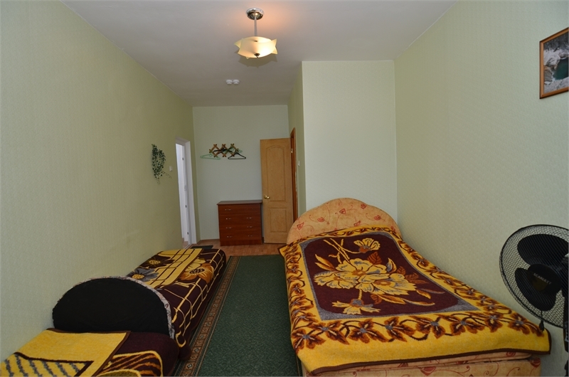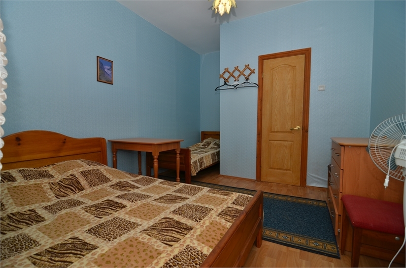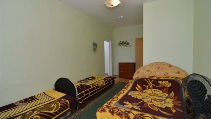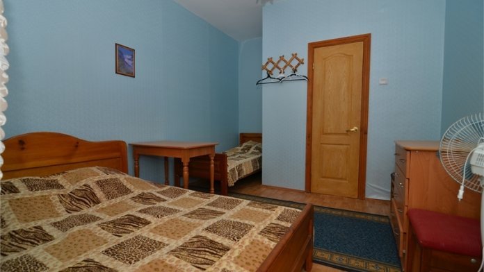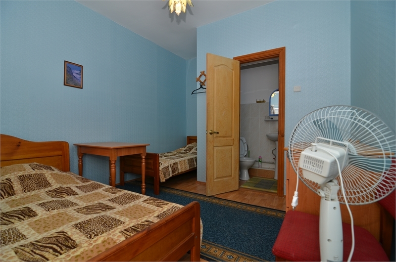 В номере: односпальная и двуспальная кровати, стулья, стол, комод, вешалка, зеркало, вентилятор, интернет, балкон (общий).