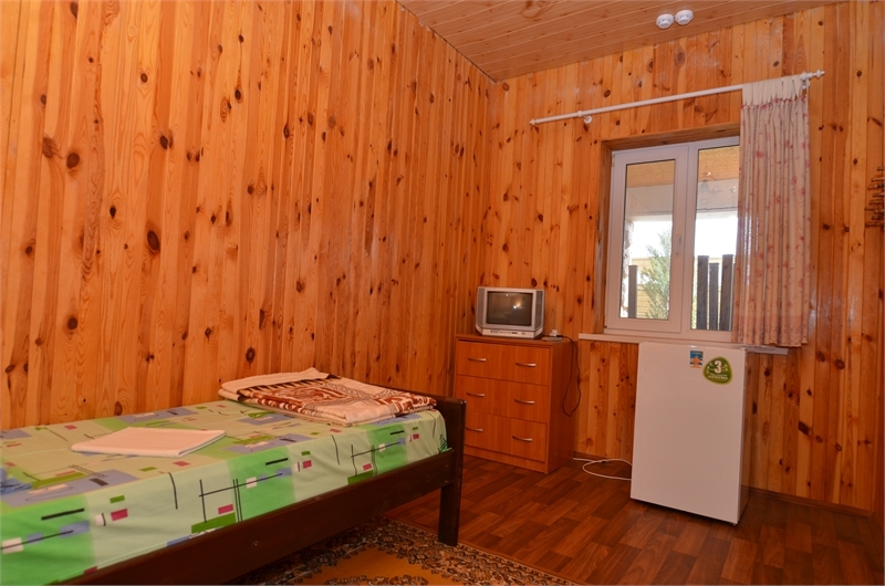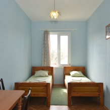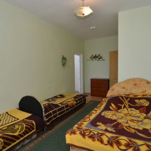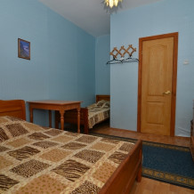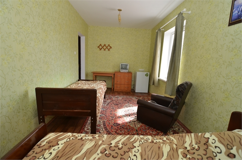 В номере: односпальные и двуспальная кровати, стулья, стол, комод, вешалка, зеркало, телевизор, спутниковое ТВ, интернет, холодильник, балкон (общий).