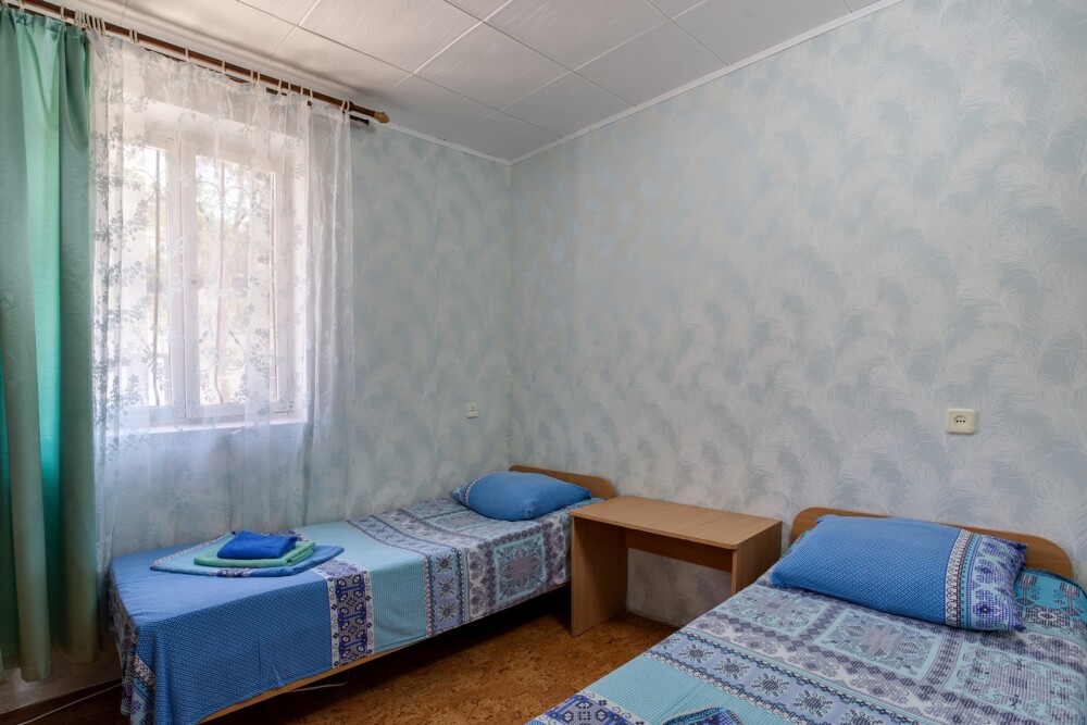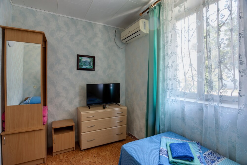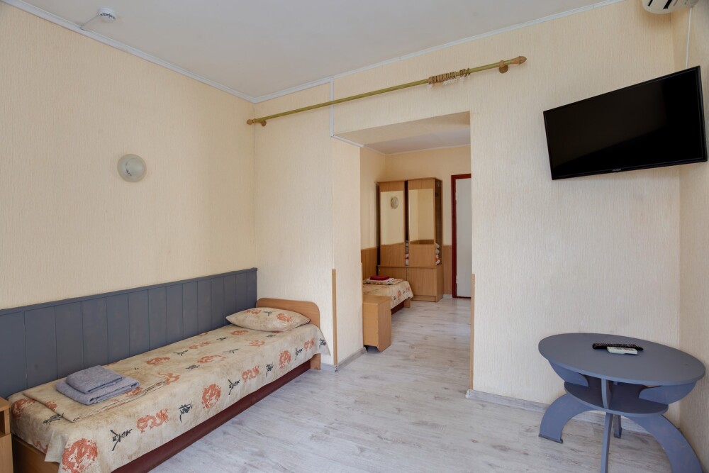 Вторая комната — больше: три одно-спальных кровати, две тумбочки, шкаф, телевизор (спутниковое ТВ), кондиционер.