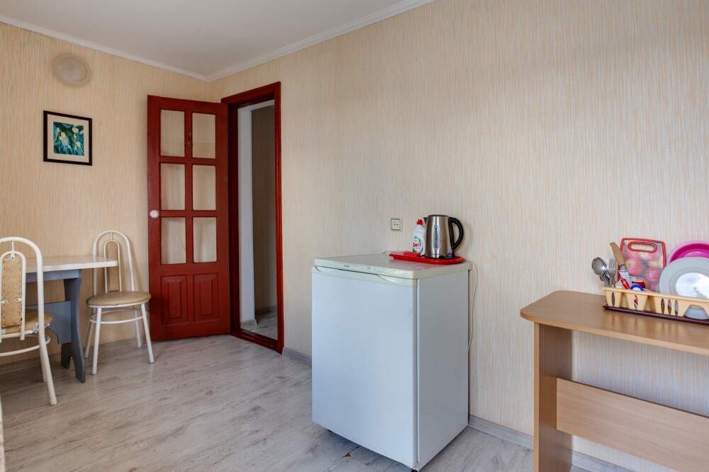 В первой комнате: холодильник, стол, стулья, электрочайник, посуда (тарелки и чашки) на 2 человека.
