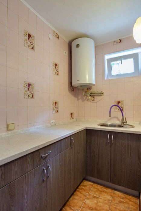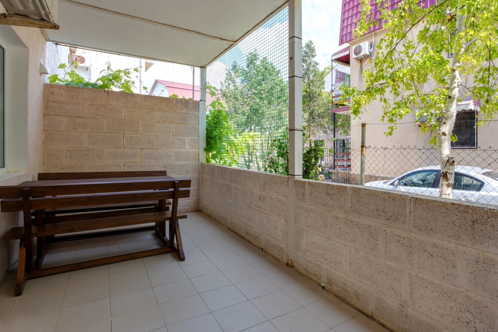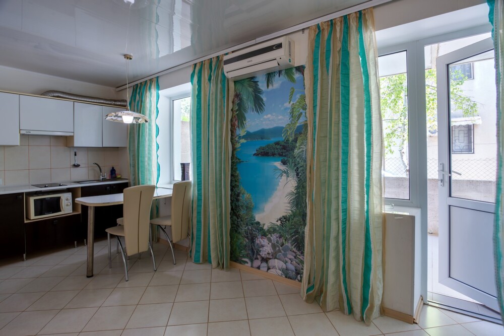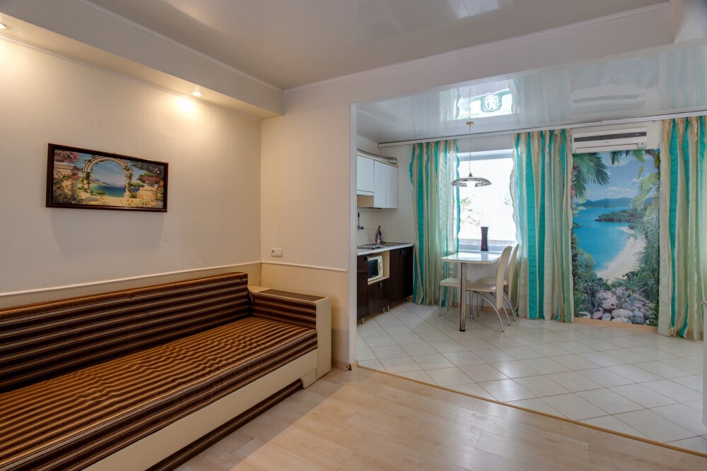 1-я комната (гостиная-студия): 2-спальный диван, TV, кондиционер, кухня с посудой, микроволновка, электропечь