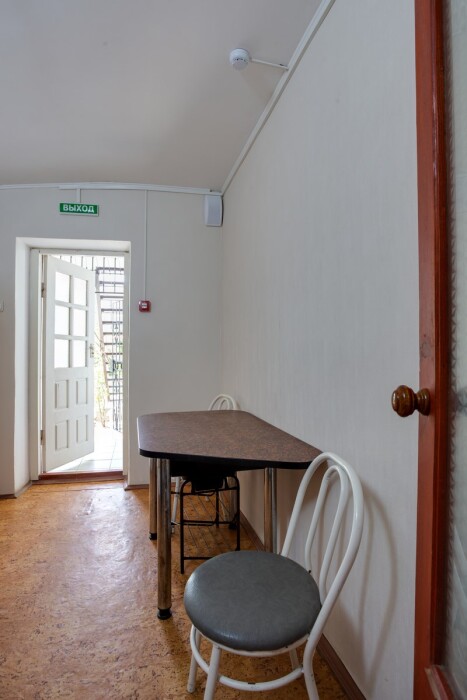 Первая комната — маленькая: стол, три стула, электрочайник, посуда (чашки, тарелки) на три человека, холодильник.