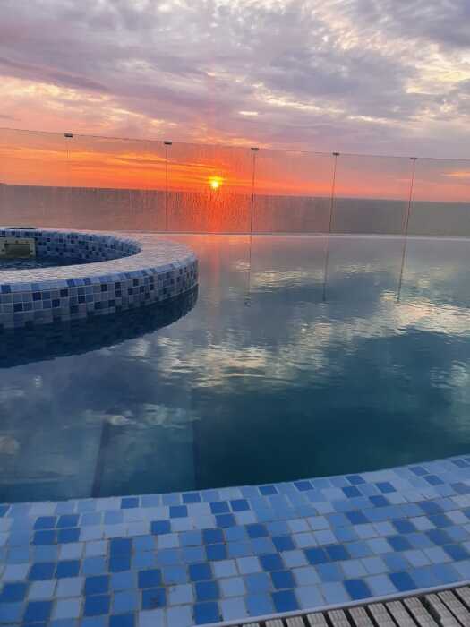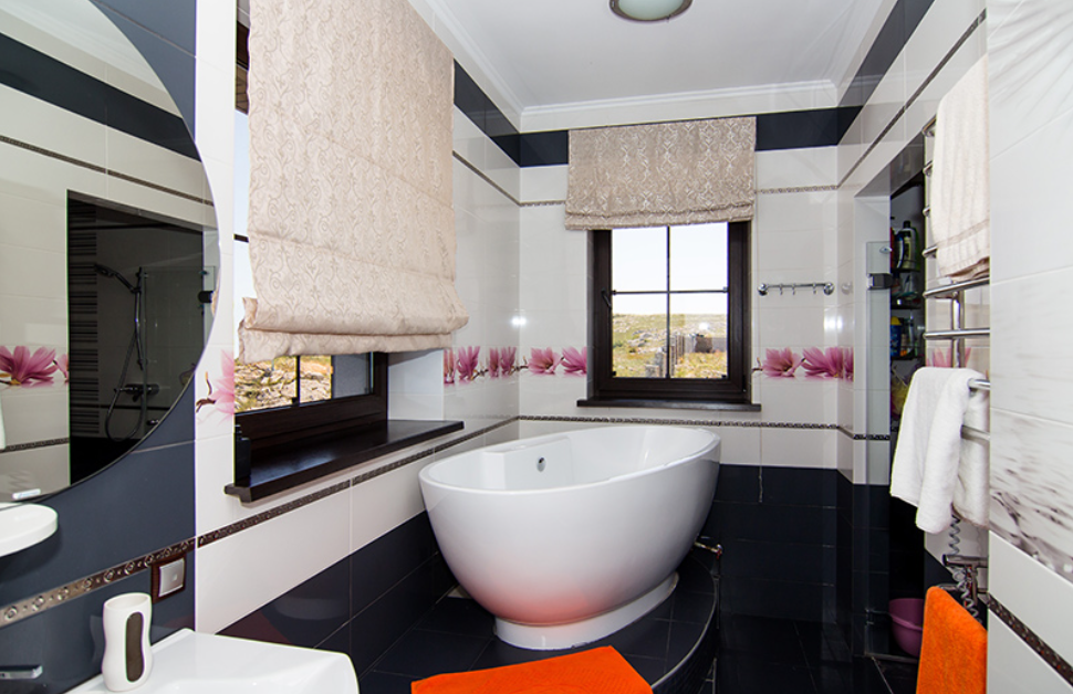 Первый этаж включает в себя зону отдыха, совмещённую с кухней, оборудованную всем необходимым, обеденную зону и имеет выход на террасу и к бассейну. Так же есть туалет и душевая комната. Есть сауна. На втором этаже расположены спальни. Каждая спальная оборудована своей климатической установкой. На этаже расположен ванная комната и туалет. Террасы - их 2. На террасах есть шезлонги.