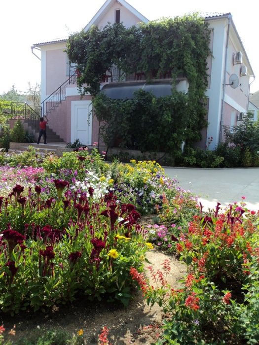 Частная усадьба - это 2-этажный особняк, в котором находятся 6 уютных двухкомнатных номеров класса «люкс». Максимальное проживание до 20 человек. Каждый номер имеет выход на большой балкон, увитый вьющимися розами и долихосом (1 этаж). Со второго этажа прекрасный вид на море и сад, а также на холмистую часть побережья.
