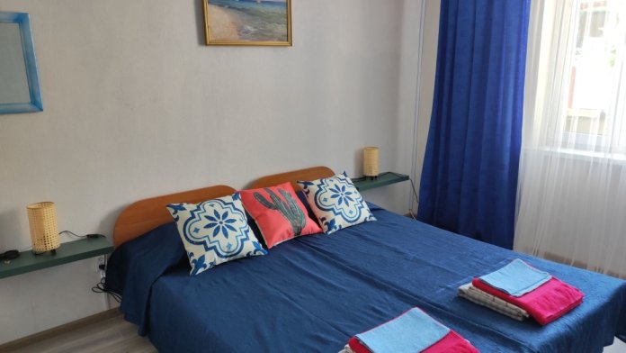 Все удобства: кухня с посудой и холодильником, санузел, спальня на 4 места с телевизором, кондиционером, бельем, Wi-fi. Есть стоянка для авто бесплатная по предварительному бронированию.