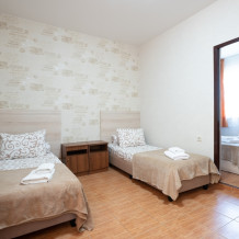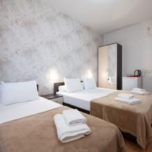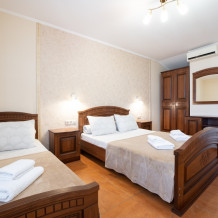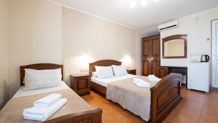 Идеальный вариант для комфортного размещения троих гостей. В номере мягкая двуспальная кровать и односпальная кровать, шкаф для одежды, стол, тумба и большое зеркало.