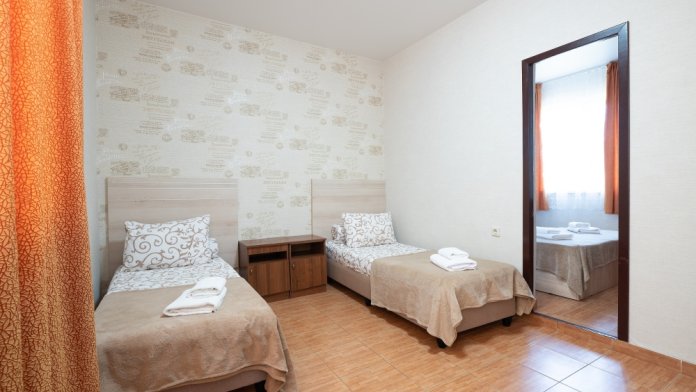 В одной комнате расположена мягкая двуспальная кровать, во второй — две односпальные кровати, что позволяет удобно разместиться гостям.