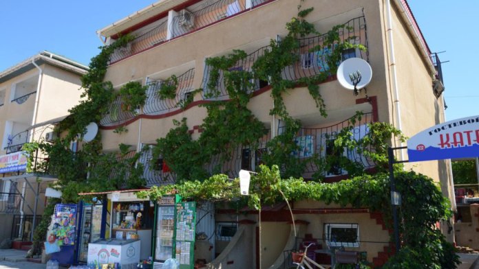 Четырёхэтажный гостевой дом у моря расположен на первой линии в 5 метрах от центрального пляжа и в 90 метрах от моря. Рядом с гостевым домом находится шикарный песчаный пляж для купания и приёма солнечных ванн, длиной 800 и шириной 80 метров. Это лучший пляж Западного Крыма с морскими развлечениями, летними заведениями (кафе и рестораны), аттракционами и водными горками.