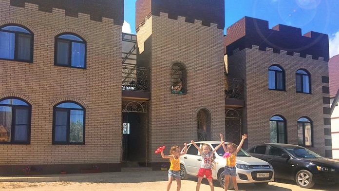 Дом ориентирован на отдых с детьми, всего 8 номеров студий, в каждом крыле замка по 4 номера. Между крыльями замка внутренний двор и крытая веранда на 2 этаже. Закрытый дворик оборудован столиками для отдыха, игрушками, местом творчества для детей. На втором этаже крытая веранда для отдыха со столиками, лестницы на крышу. Крыша на замке - эксплуатируемая, оборудована зоной отдыха, барбекю, развлечениями для детей, детским бассейном.
