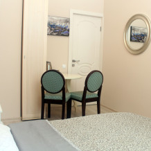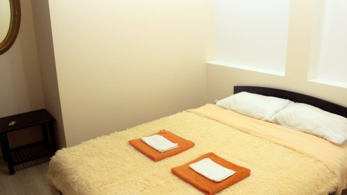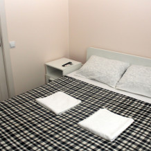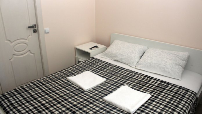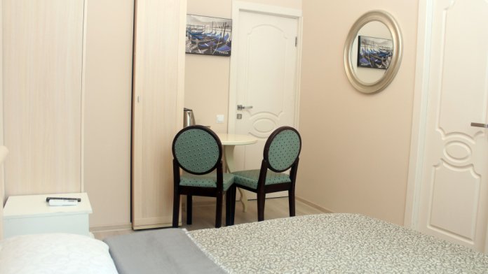 Двухместный номер с 1 двуспальной кроватью . В Номере: телевизор, WI-FI, вентиляция, тумбочки, шкаф, зеркало, теплый пол, ванная комната в самом номере (ванная, раковина, унитаз, фен)
