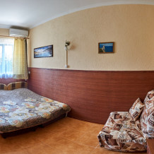 Двухкомнатный номер на втором этаже – апартаменты для четверых, с кухней – столовой на светлой веранде с балконом и прекрасным видом на зелень парка.