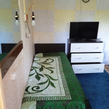 На крыльце два номера. Есть шкаф для одежды, стол, прикроватные тумбы, большое зеркало. Холодильник находится в кухонной зоне.не в жилой комнате, спокойному сну ничего не мешает. В комнате всегда прохладно без кондиционера, даже в сильную жару. Состояние мебели, матрасов, сантехники отличное. Постельное бельё, комплекты полотенец каждому гостю. Есть набор посуды. Вентилятор напольный выдается по запросу. Соблюдается распорядок дня, с 23 до 07 час режим тишины, заселение не производится. Посторонних приводить нельзя. Регистрация строго по паспорту.