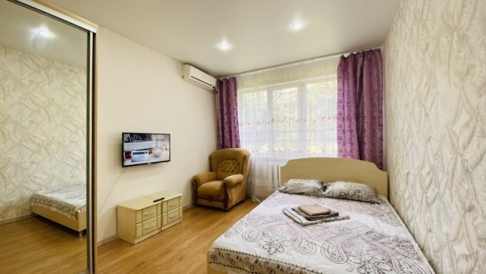 Одна комната отдельная с двуспальной кроватью, а вторая- объединена с кухней и в ней стоит раскладной диван, можно положить спать детей.