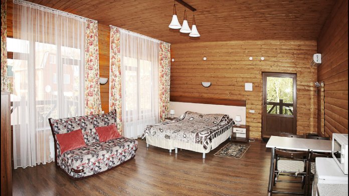 Номер-студия — большой комфортный современный однокомнатный номер, площадью 30 кв.м. с отделкой под сруб. Расположен на 2м этаже.