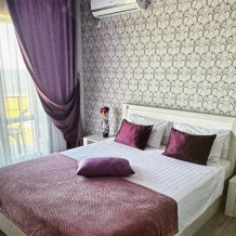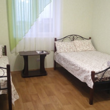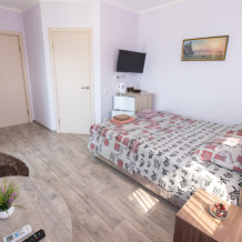 Двухместный номер расположен на третьем этаже,в номере двуспальная кровать с ортопедическим матрасом,два кресла банкетки, журнальный столик,прикроватная тумбочка,шкаф, холодильник, чайник, минимальный набор посуды, телевизор, кондиционер, санузел,балкон(стол, два стула, сушка для белья) .