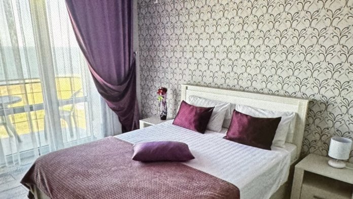 Трёхместный номер вместимостью до трёх человек,в номере полуторная кровать и одна односпальная,шкаф, журнальный столик, холодильник, кондиционер, телевизор, санузел.Номер с балконом, открывается прекрасный вид на море,скалы,сидя за столиком можно проводить красивейшие закаты.